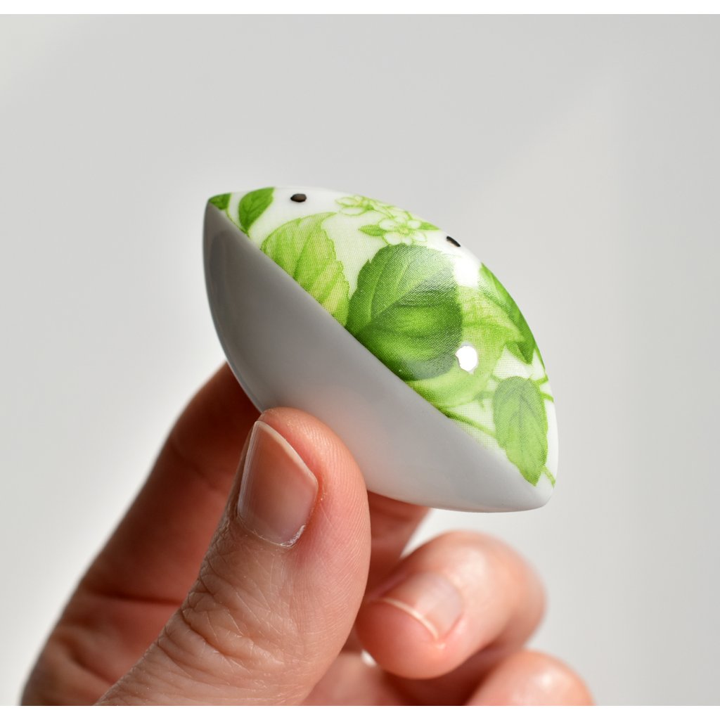 Brož je vyrobená z čistě bílého porcelánu, který je vypálený na 1400°C. Dekorace zelenou barvou a lesklou platinou.