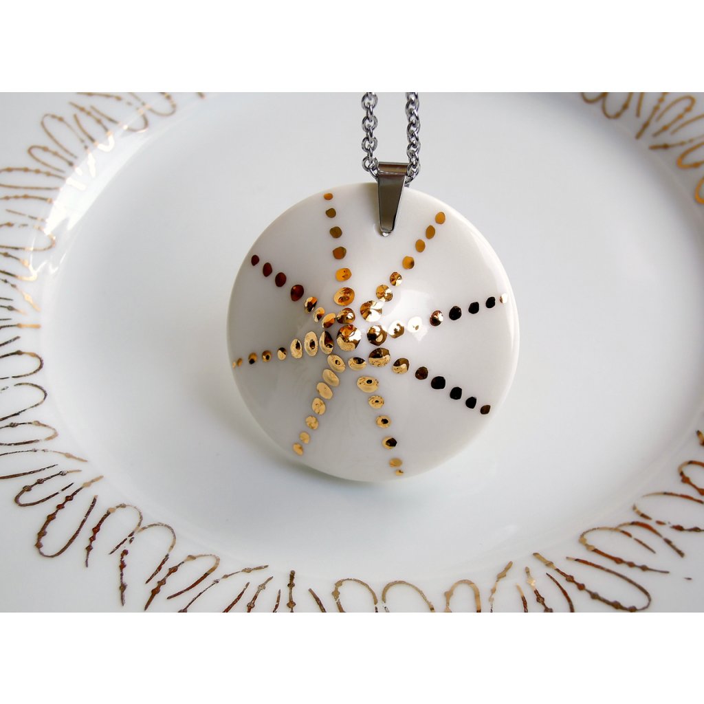Čistě bílý porcelánový přívěsek, dekorovaný pravým lesklým zlatem se kterým zazáříte.