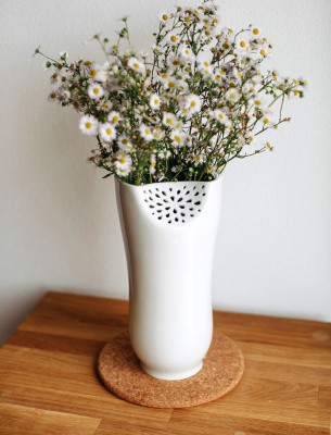 Zahrádka oplývá růžemi, karafiáty, také měsíčkem lékařským a další pestrobarevnou nádherou. V jednoduchosti je krása a malé detaily jsou tím, co se počítá. Prosté linie a jemný krajkový lem nechává vyniknout krásu růží. Tahle krajková váza je na růže jako dělaná a potěší svým univerzálním vzhledem a díky širokému hrdlu to v ní sluší i veeeelikému pugetu. Na jednu růži jsem navrhla vázičku, která se nasazuje na sklenku. Nezabírá moc místa na stole a navíc vyzdvihne sofistikovanost růže i s jejími trny.