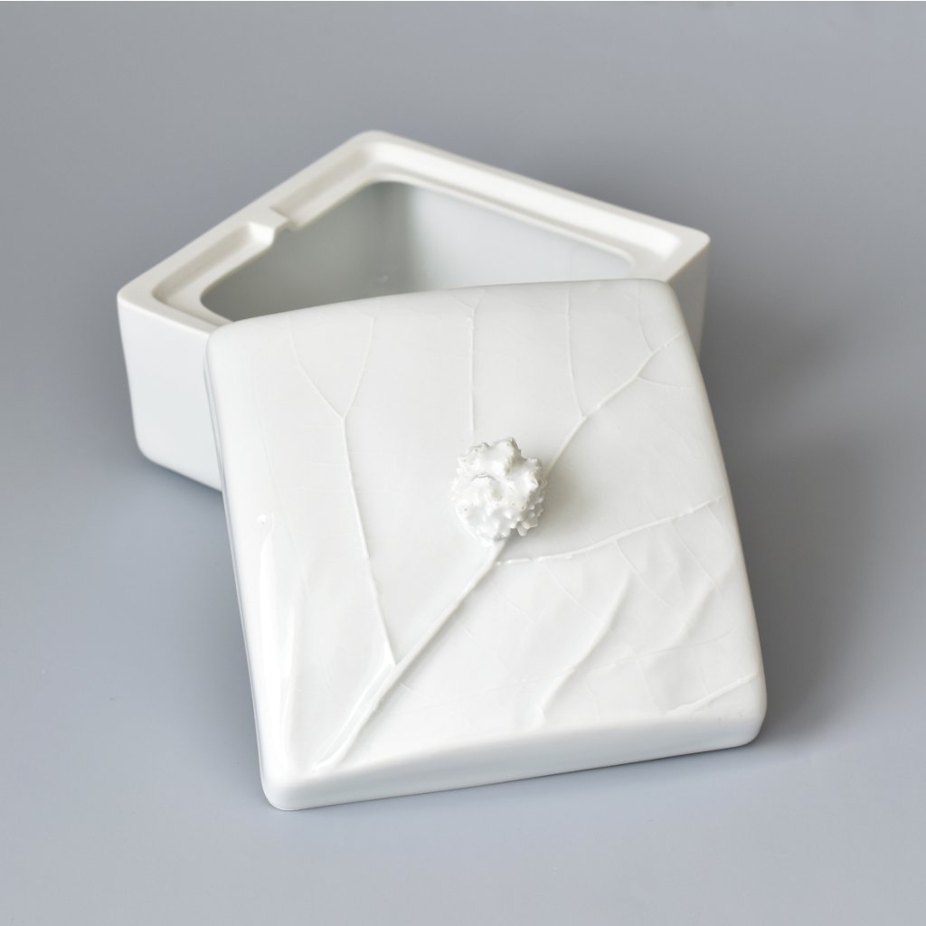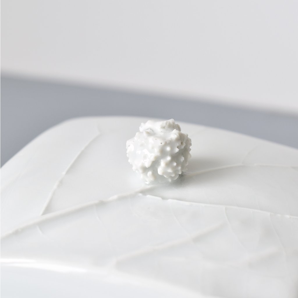 Porcelánová dóza s jemným otiskem listu na víčku a s bambulkou z bodláku :), která slouží jako úchytka. Usušený bodlák (Bělotrn modrý) jsem namočila do licí porcelánové hmoty a vypálila v peci. Organická složka vyhořela a zůstal věrný porcelánový otisk přírodniny.
