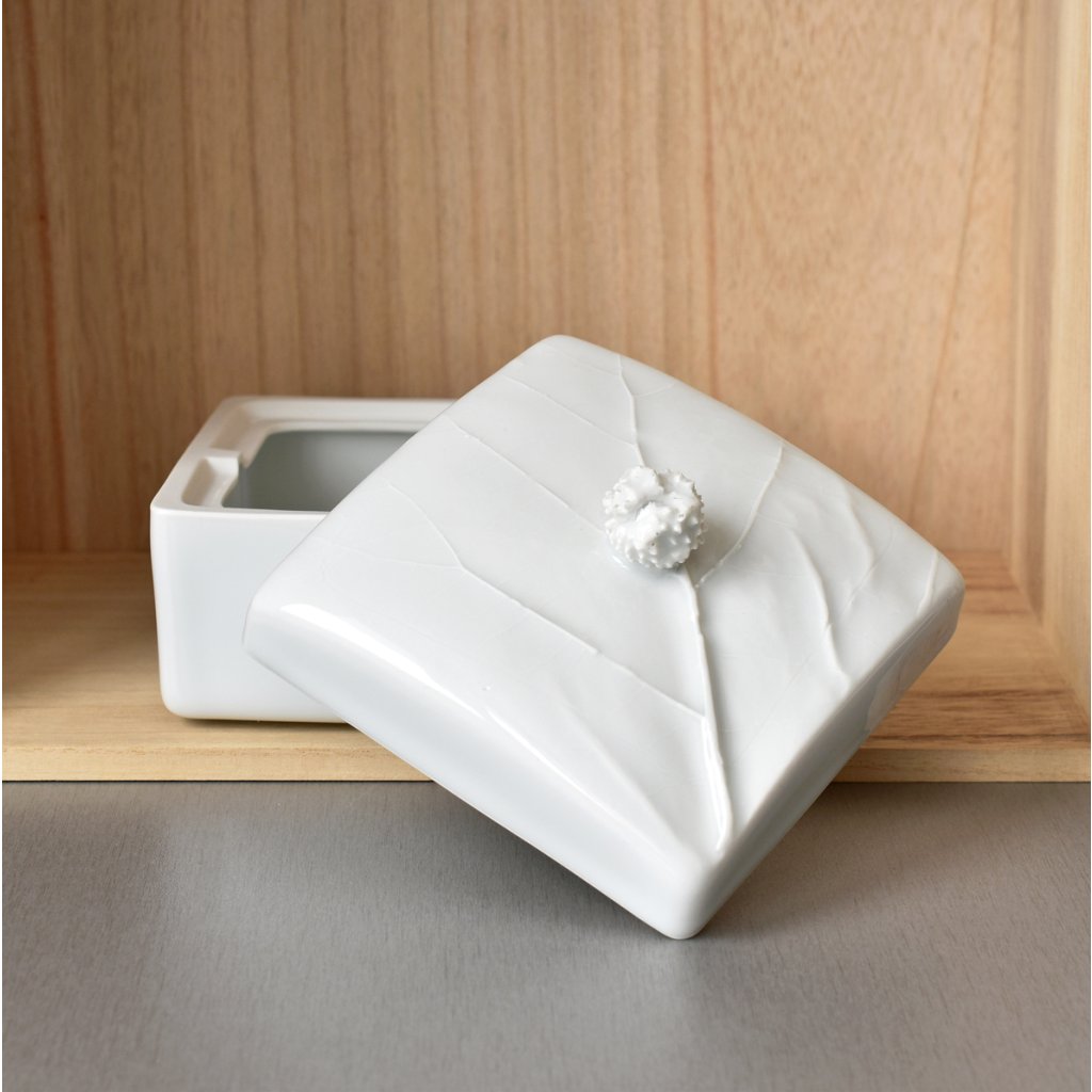 Čistě bílý porcelán vysoko pálený na 1400°C. Dóza je uvnitř glazovaná. Víčko přesně sedí, díky do sebe zapadajícímu zámečku.