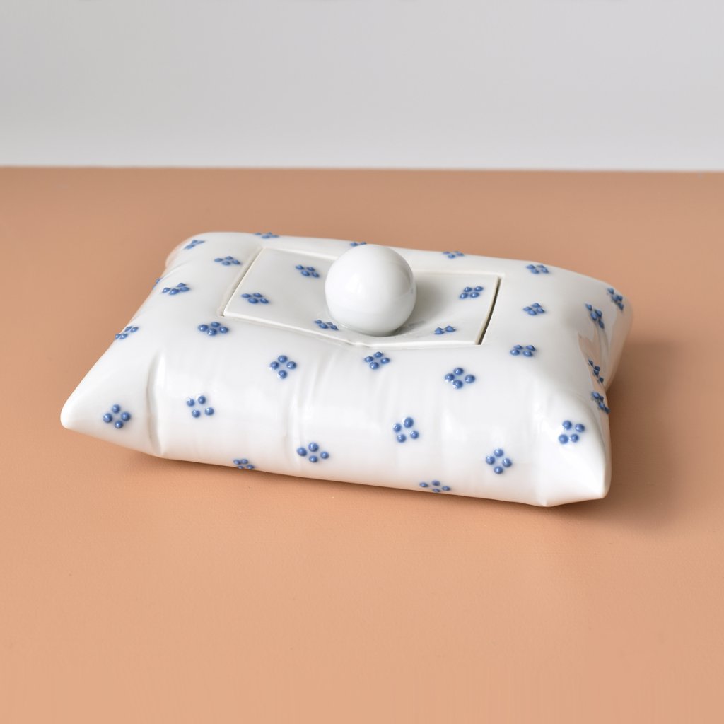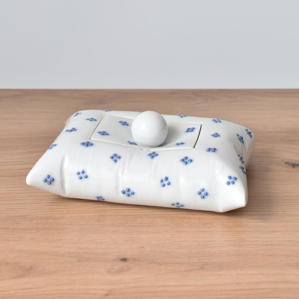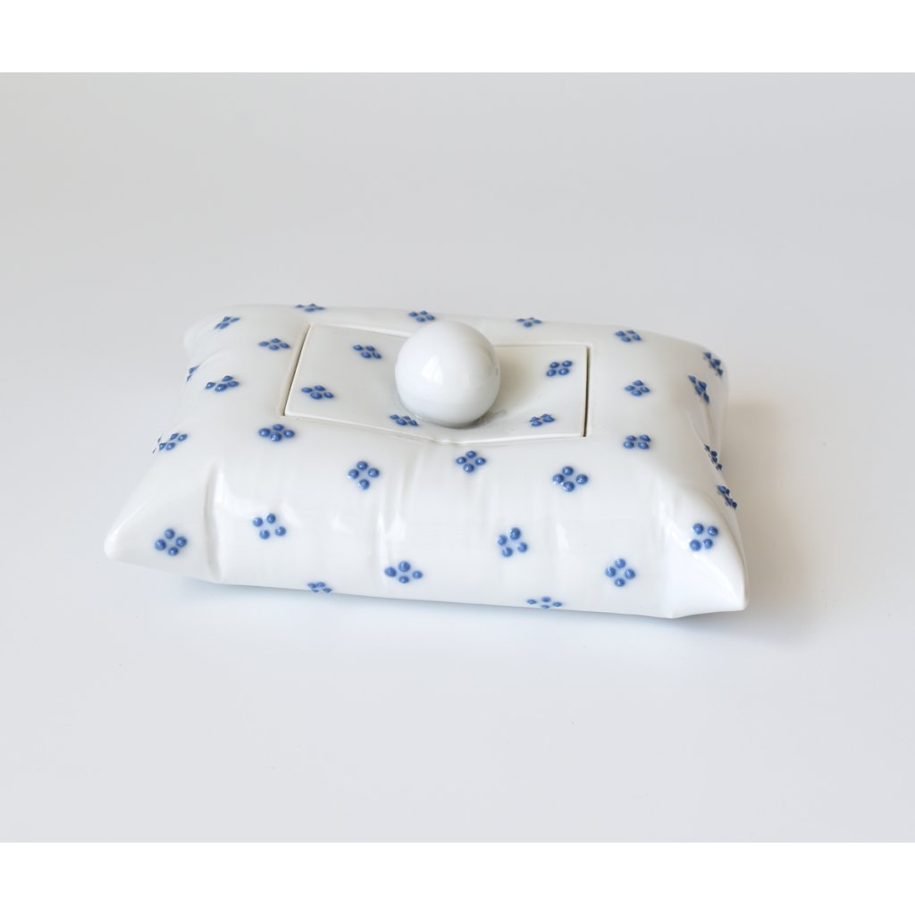 Dekorativní porcelánová dózička na zahnání zimní deprese. Zachumlat se, zasnít a utéct od starostí všedních dnů. Tvar polštářku, symbolizuje pocit bezpečí, teplo, domov a také tajemství malého dětského světa, které je ukryté v každém z nás.