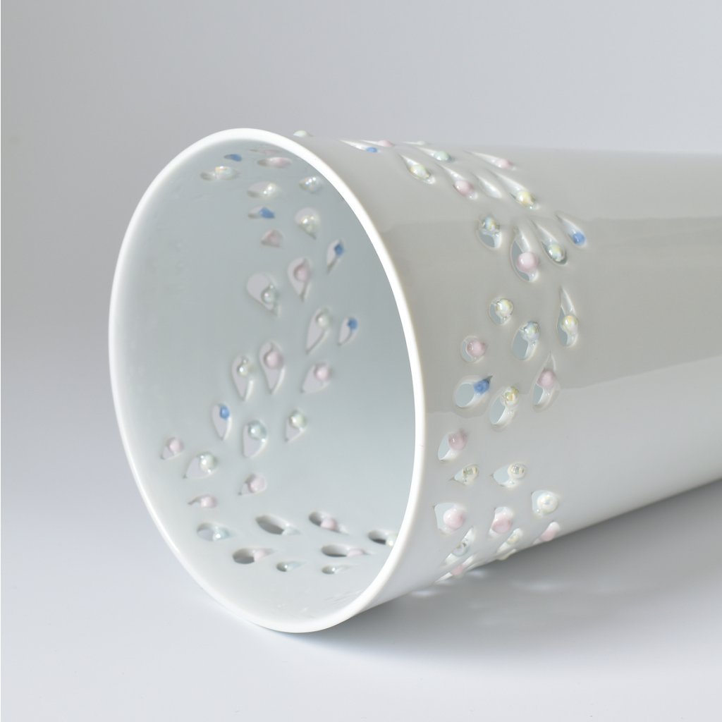 Vázu jsem vyrobila litím karlovarské porcelánové hmoty do sádrové formy. Následně vyretušovala, vypálila na 950°C, ozdobila velmi pracnou speciální technikou, naglazovala, znovu vyretušovala, vypálila podruhé na 1400°C, nedekorovala a vypálila potřetí na 780°C.