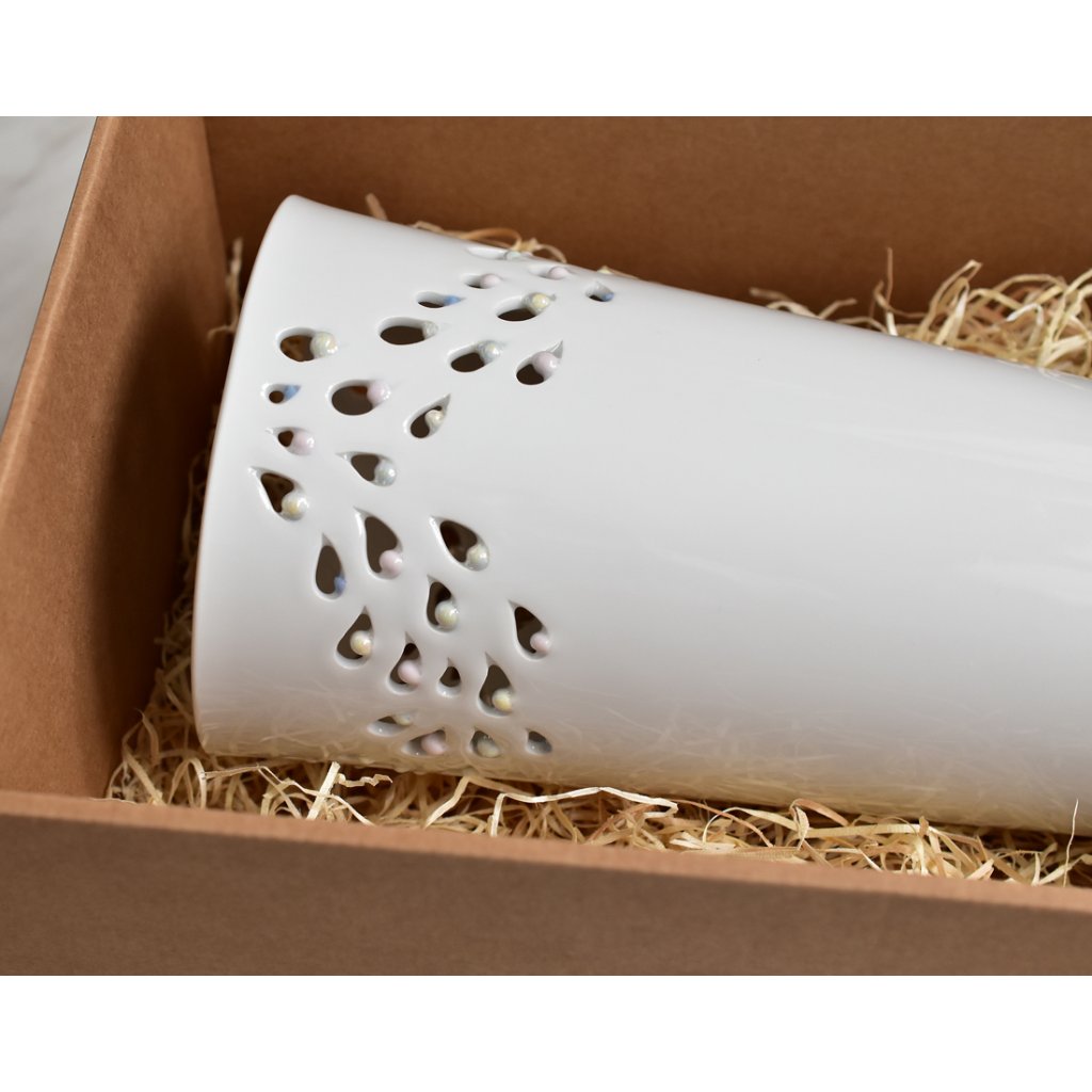 Velká luxusní porcelánová váza ručně prořezávaná, s platinovými a světlemodrými kuličkami. Krásný inspirativní objekt, který ozvláštní váš interiér i bez květiny. Výška 32 cm. Jediný originál.
