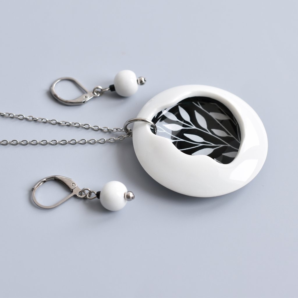 Dekorovaný černou a bílou barvou. Součástí šperku jsou náušnice, které pošlu spolu s přívěskem.