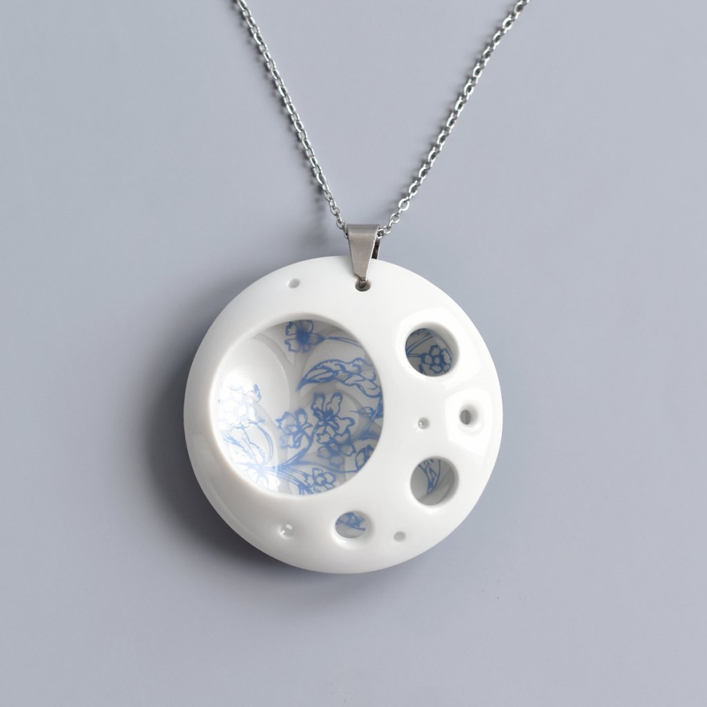 Šperk je vyrobený z čistě bílého karlovarského porcelánu, který je vypálený na 1400°C. Ručně dekorovaný. Dekorace je vypálena na 780°C.