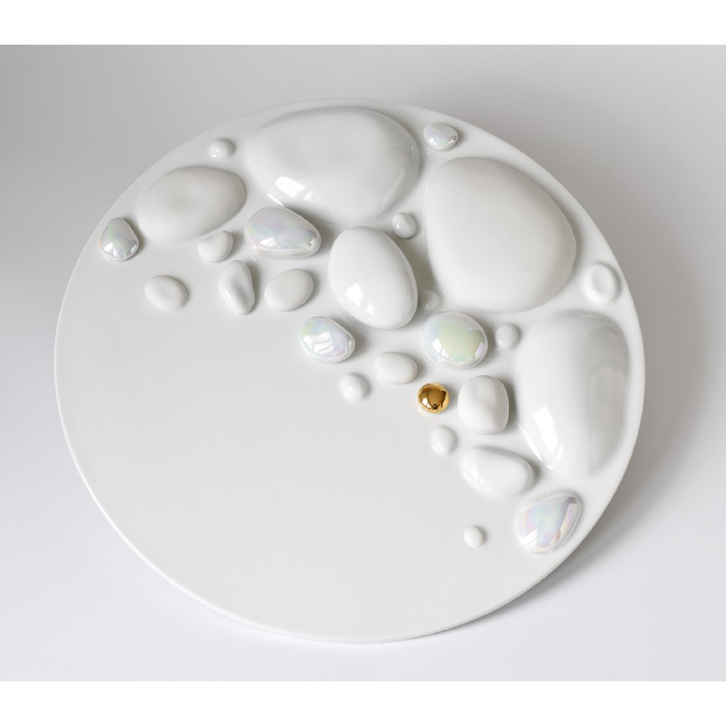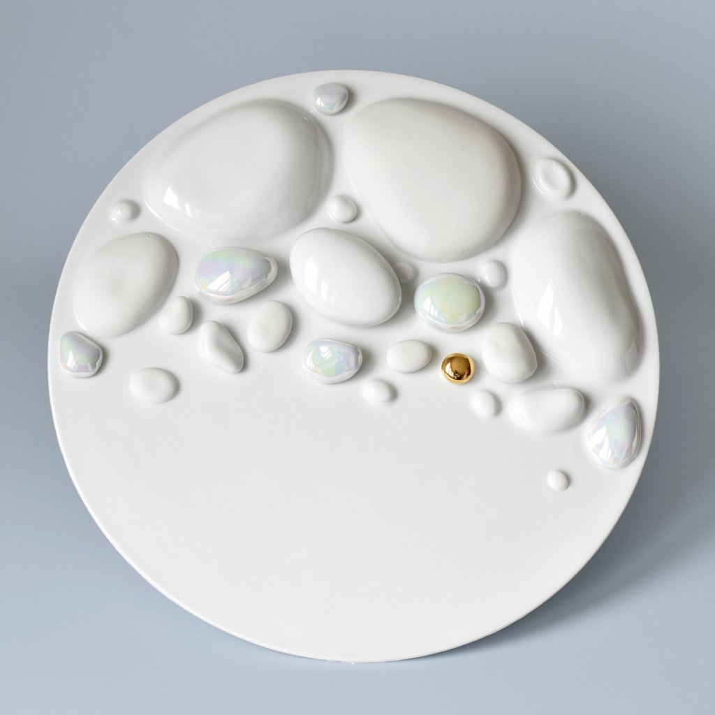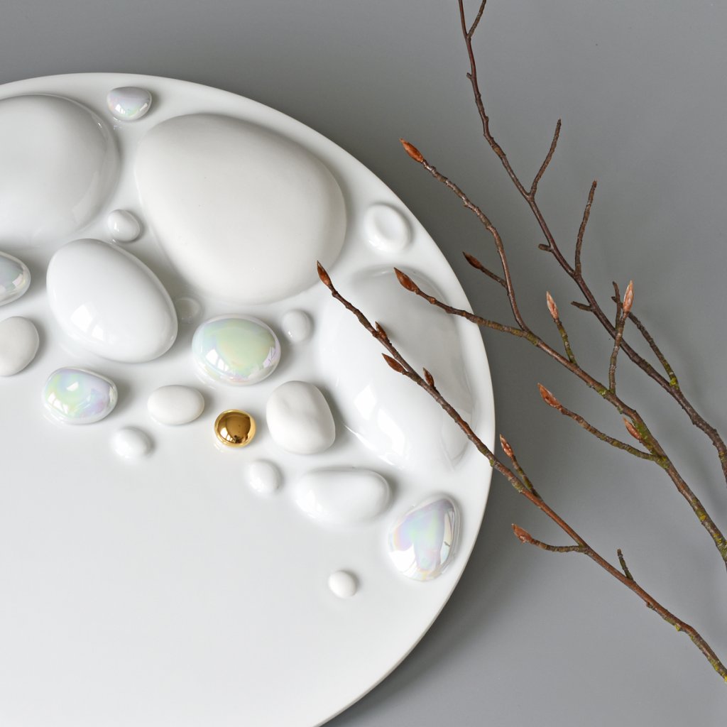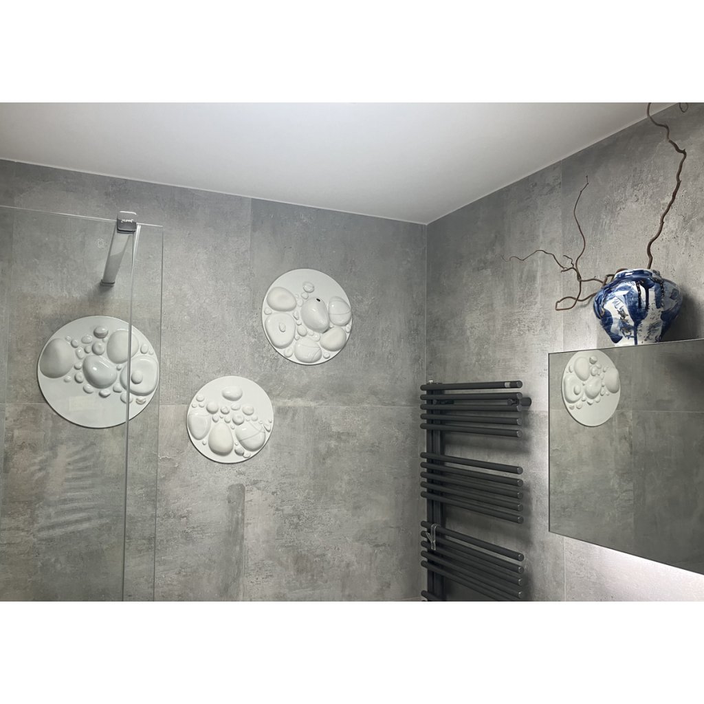 Tento originální ručně vyrobený kruhový porcelánový obraz, (nástěnná plastika), krásně prosvětlí a ozvláštní váš domov. (Hodí se k druhému porcelánovému obrazu Oblázky z řeky Vydry menší