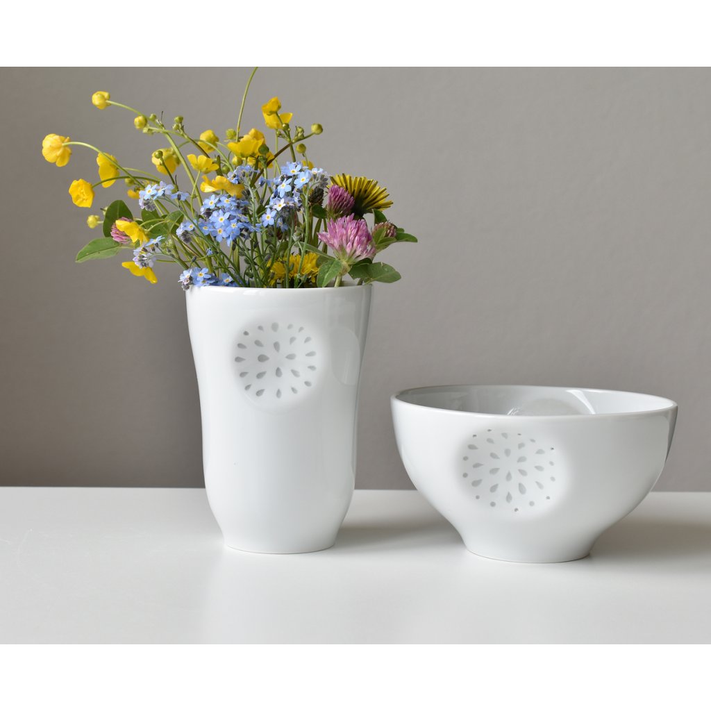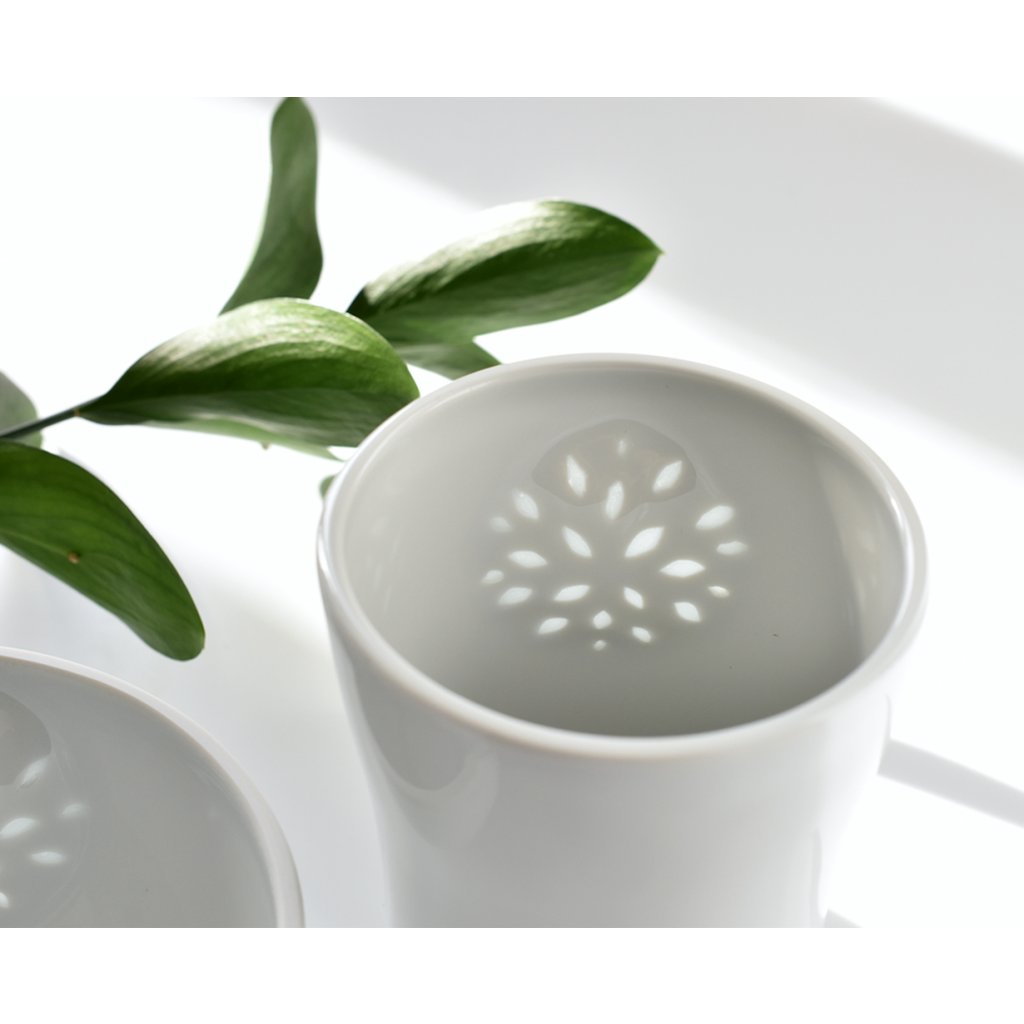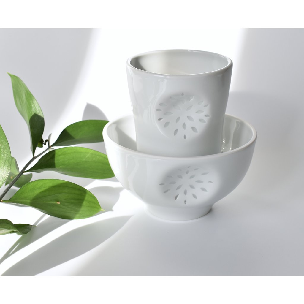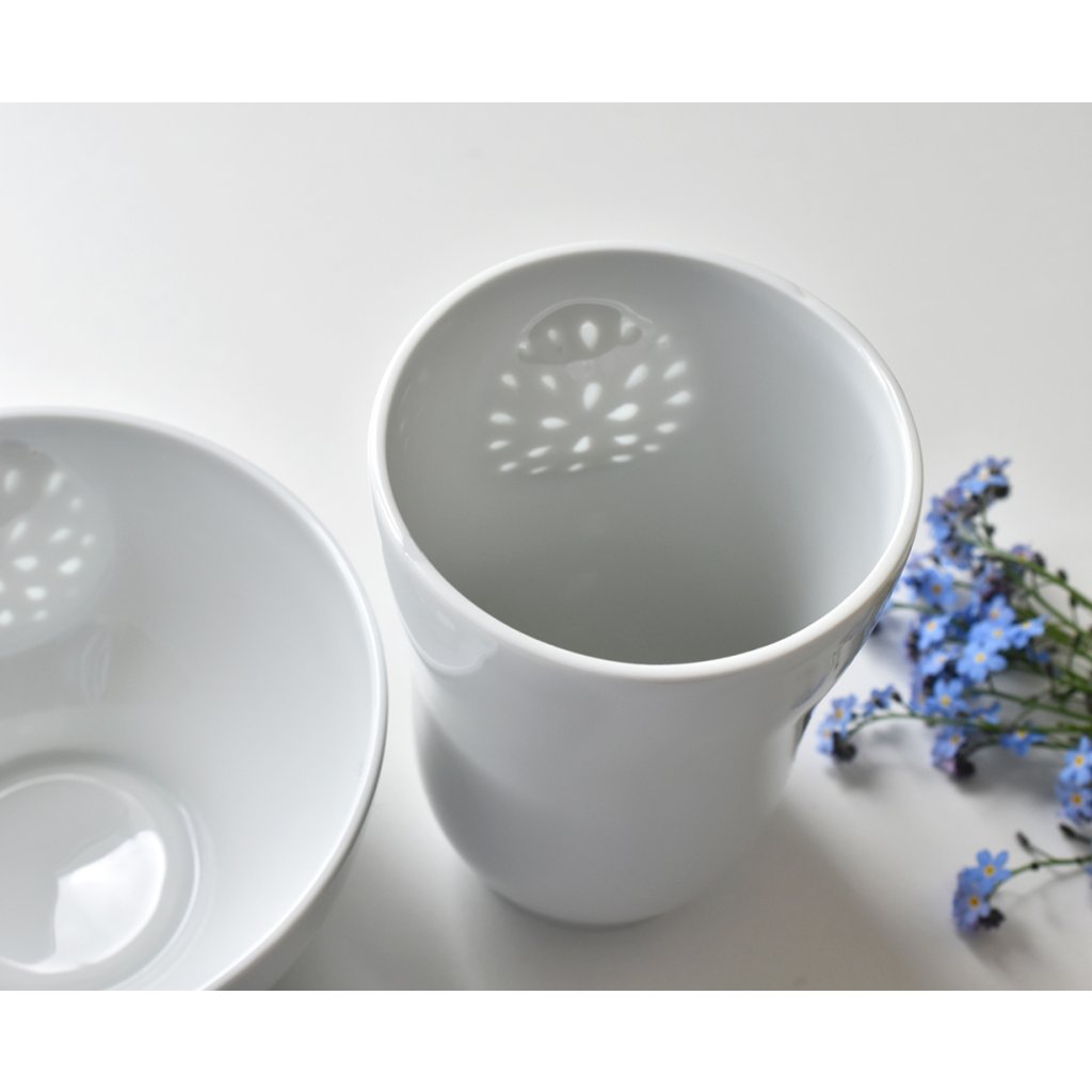 Porcelánový pohárek s miskou inspirovaný tradičním tzv. rýžovým porcelánem, který jsem přetvořila do vlastního designu.